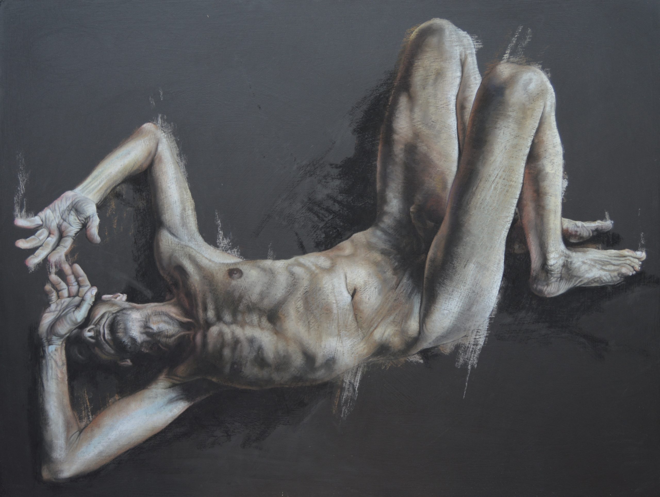 Morph consists of a collection of figurative pastel and charcoal drawings, relief printing and mixed media artworks depicting vulnerable male nudes and women portraits and nudes. The exhibition also includes a series of plant and animal drawings and abstract ‘de-constructed’ artworks.