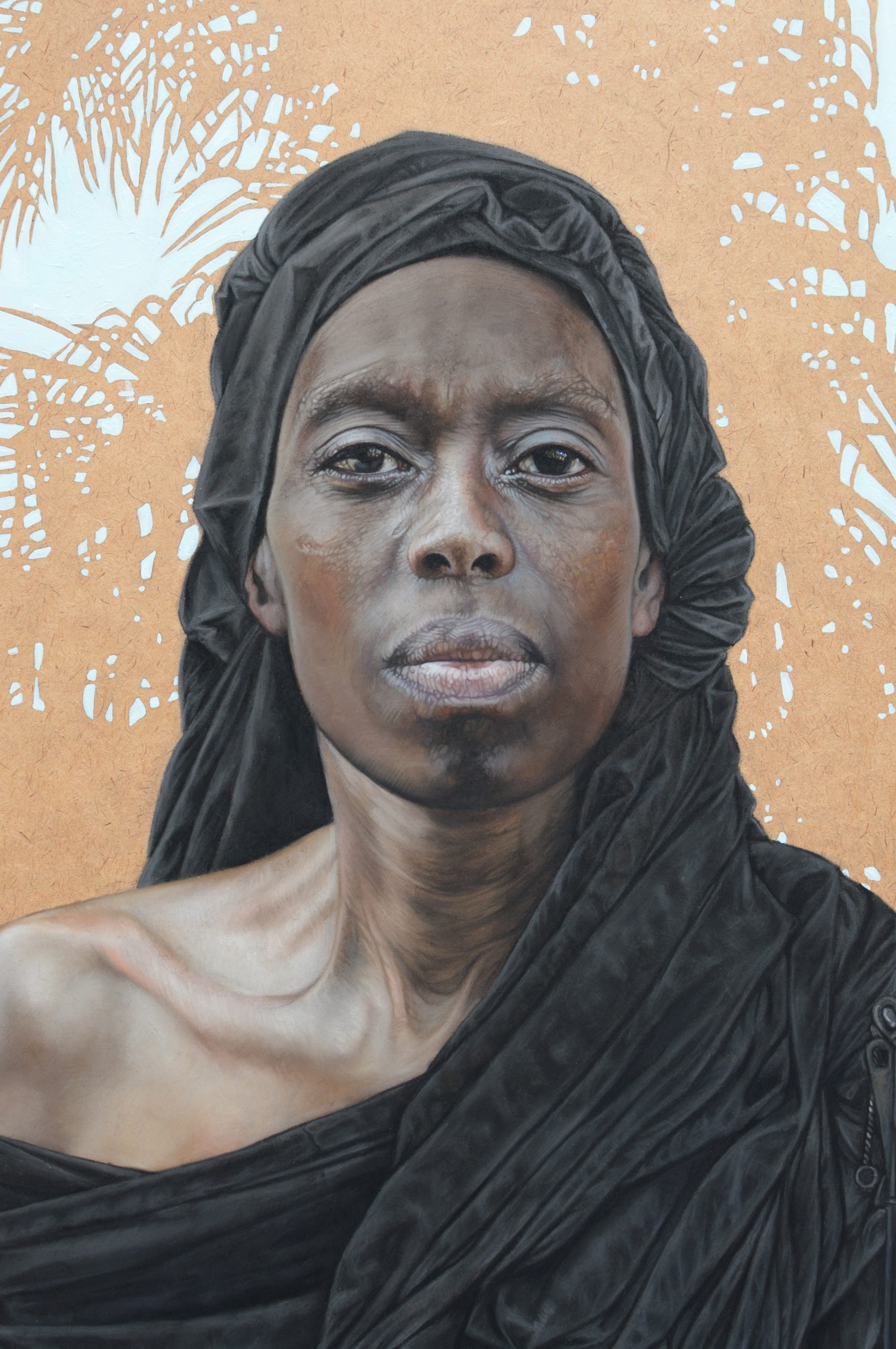 A large portrait of a woman holding an AK-47 rifle and surrounded by floral motifs and palm fronds, is imagery often used in contemporary African art and is fast becoming a classical symbol of the strong nurturer who can defend herself, her family and her natural environment. She represents the actual situation in which many African and middle Eastern women find themselves today. The image was adapted from a media photograph of an Afghan girl who shot and killed six Taliban members who killed her parents, thereby saving herself and her younger brother from kidnapping. This is a real life example of the weak female drastically transformed in her re-possession of power.